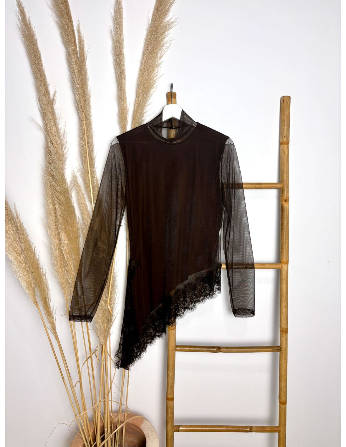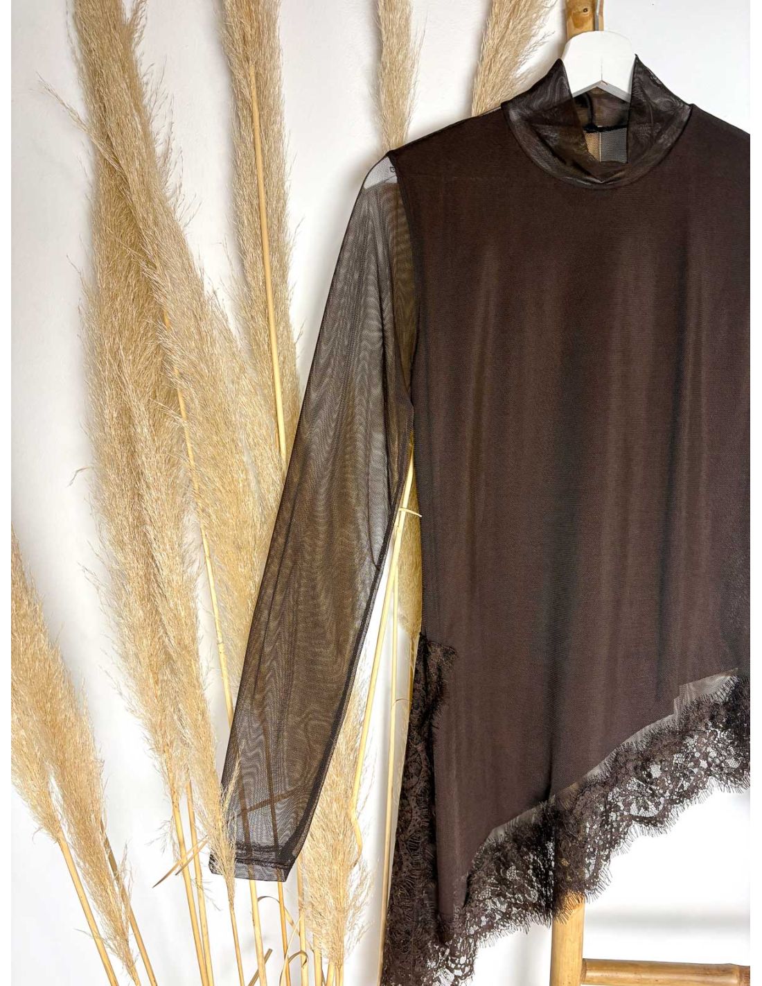 Top chocolate de tul asimétrico con encaje