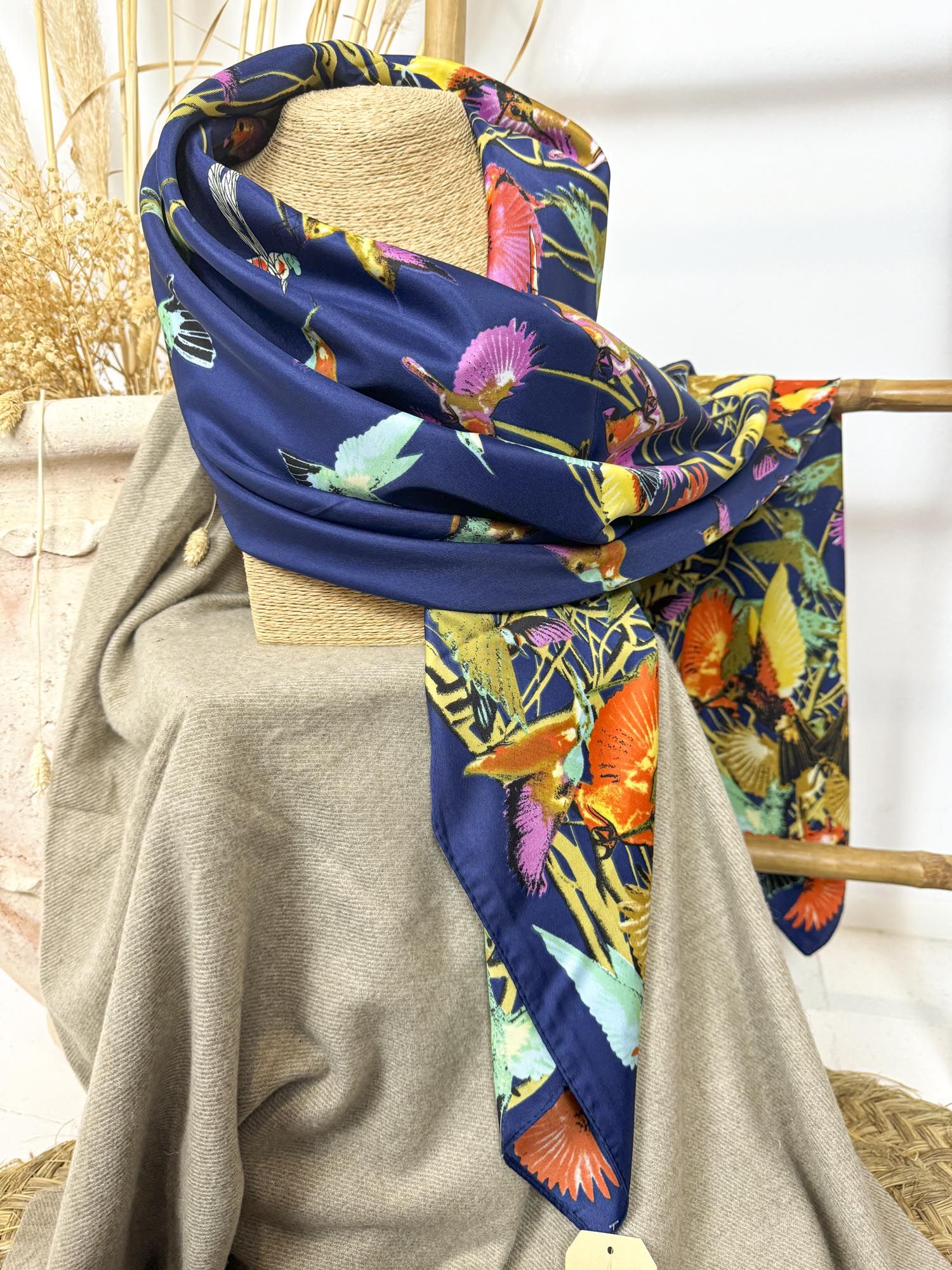 Pañuelo 125x125 cm azul estampado colibrí colores